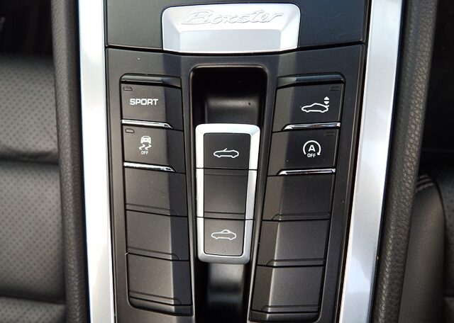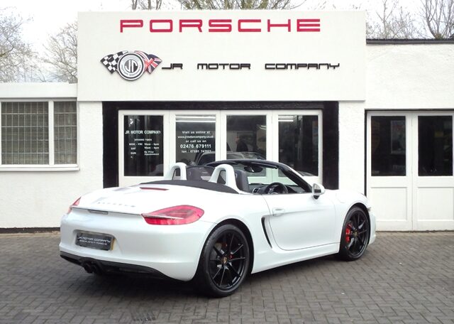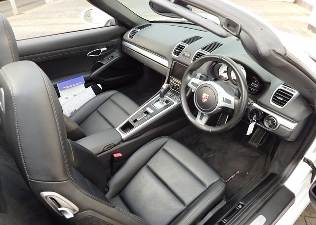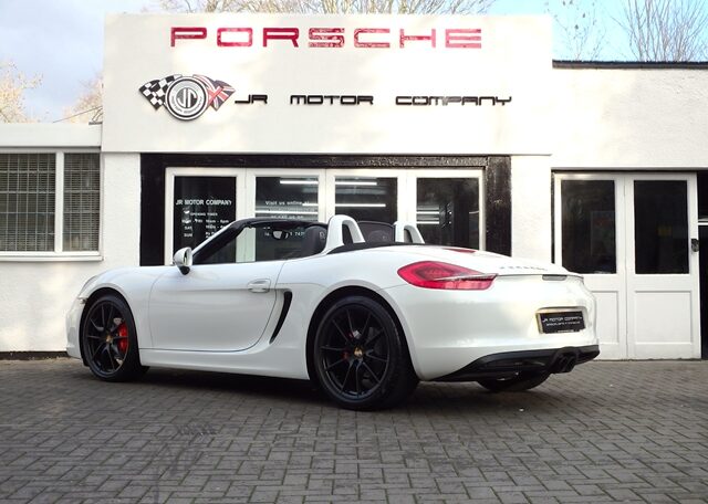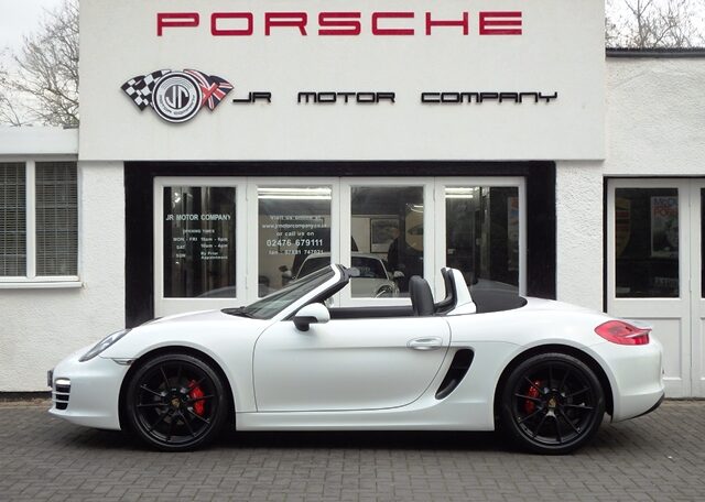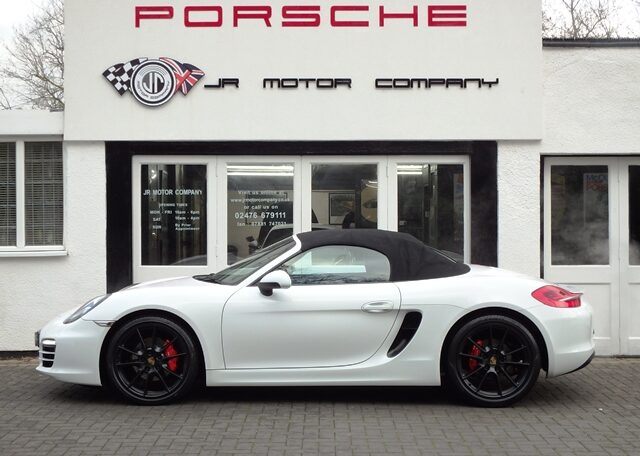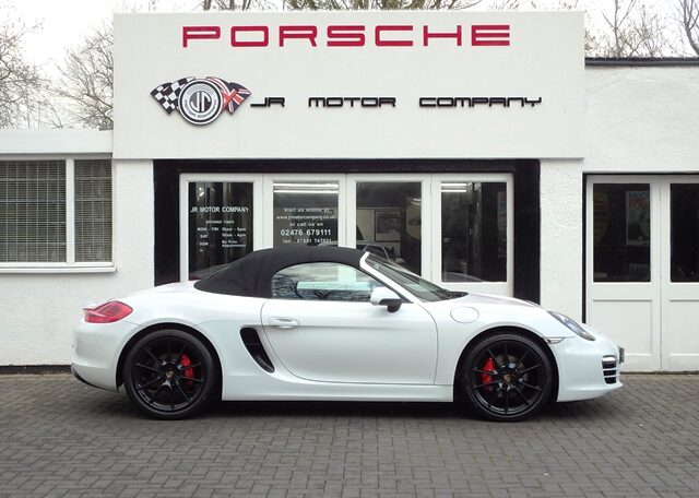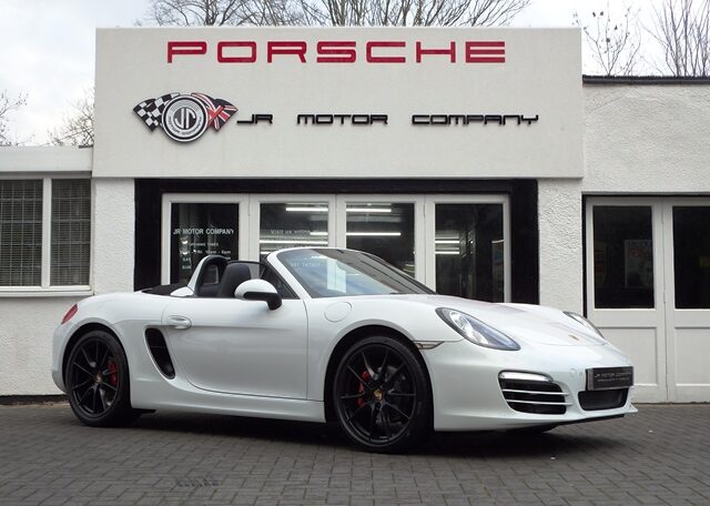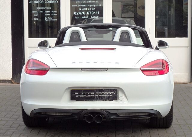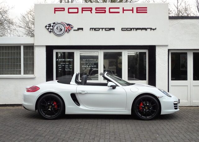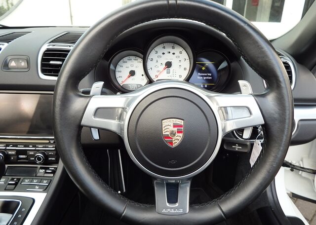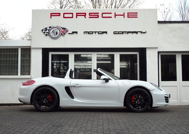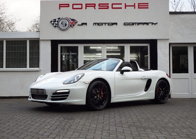 Cars like this don’t come around very often!This is a huge specification one of a kind Boxster 2.7 981 PDK Finished in Pure White paint with a huge list of factory fitted options which includes Black smooth leather heated seats,Sport Design smooth leather steering wheel with paddle shifters,(PDK) Porsche Doppelkupplung double clutch 7 speed gearbox,dual zone climate controlled air conditioning,silver dials,(PSM) Porsche Stability Management,Sport mode,power steering plus,(PCM3) Porsche communications management Satelite navigation inc telephone module,Bluetooth interface and USB multimedia interface linked with Porsche sound package plus,top tinted windscreen,Auto dimm interior mirror with rain sensor,auto light function,bi xenon headlights,front and rear ultrasonic park assist,Porsche over mats,wind deflector with fly catchers,rollover bar finished in bodycolour,deletion of model designation,sports exhaust tailpipes in black,black hood,red calipers,fully refurbished 20 inch Carrera S alloy wheels finished in satin black with new OEM colour crested centers wrapped in Pirelli P Zero N rated tyres (alternative wheel options available upon request) to complete the package.Previously supplied by us this stunning Boxster comes complete with a fully documented OPC Porsche center plus specialist service record totaling 7 stamps recently completed by ourselves together with all spare keys and handbook pack.Stunning looks with a huge specification and impeccable service portfolio!