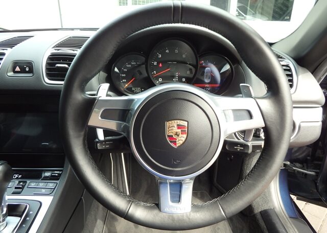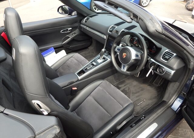 This is a great specification Boxster 2.7 981 PDK Finished in Dark Blue metallic paint with a massive list of factory fitted options which includes black leather and alcantara heated seats,black dials,3 spoke smooth leather Sport design steering wheel with paddle shifters,dual zone climate controlled air conditioning,cruise control,seat belts in guards red,(PSM) Porsche Stability Management,Sport mode,Pioneer SPH-DA160DAB Carplay with DAB,Bluetooth linked with Porsche sound package plus,top tinted windscreen,Porsche overmats,rear park assist,electric folding exterior mirrors,mesh wind deflector with flycatchers,auto headlights,black hood,fully refurbished 19 inch Boxster S alloy wheels with colour crested centers wrapped in Hankook Ventus S1 Evo3 N rated tyres to complete the package and a very special 981.This stunning Boxster comes complete with a fully documented OPC Porsche center plus specialist service record together with all spare keys and handbook pack.Stunning looks with a great specification,Outstanding!