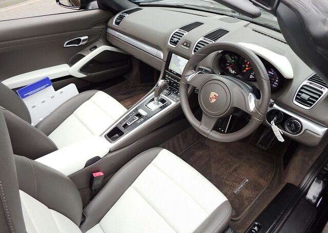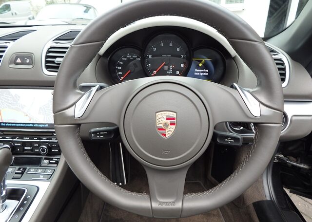 This is a rare specification Boxster 2.7 981 PDK Finished in Basalt Black metallic paint with a massive list of factory fitted options which includes Agate grey/Pebble grey smooth two tone leather package including leather instrument surround,center console and door handles,smooth leather heated seats,black dials,alluminium interior trim package,3 spoke smooth leather steering wheel,dual zone climate controlled air conditioning,cruise control,(PSM) Porsche Stability Management,Sport mode,(PCM3.1) Porsche communications management inc Sat Navigation module CD player,telephone module,Bluetooth Phone prep and aux audio interface linked with Bose sound package,top tinted windscreen,Porsche overmats,mesh wind deflector with flycatchers,auto headlights,black power hood,ultrasonic park assist front and rear,electric folding exterior mirrors,auto dimming mirrors with rain sensor,rollover bar in bodycolour,fully refurbished 20 inch Carrera Classic alloy wheels with new oem colour crested centers wrapped in Pirelli P Zero N rated tyres with calipers in finished in red to complete the package and a very special 981.This stunning Boxster comes complete with a fully documented OPC Porsche plus specialist service record totalling 6 stamps just completed by ourselves together with all spare keys and handbook pack.Stunning looks with a huge specification,Outstanding!