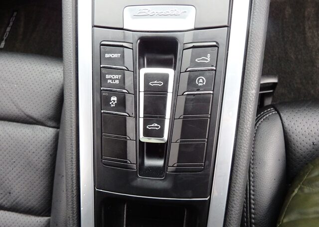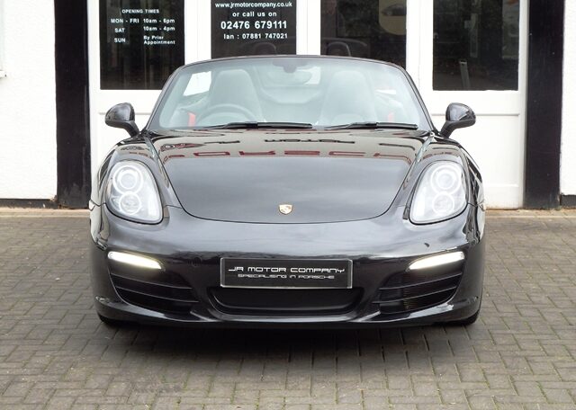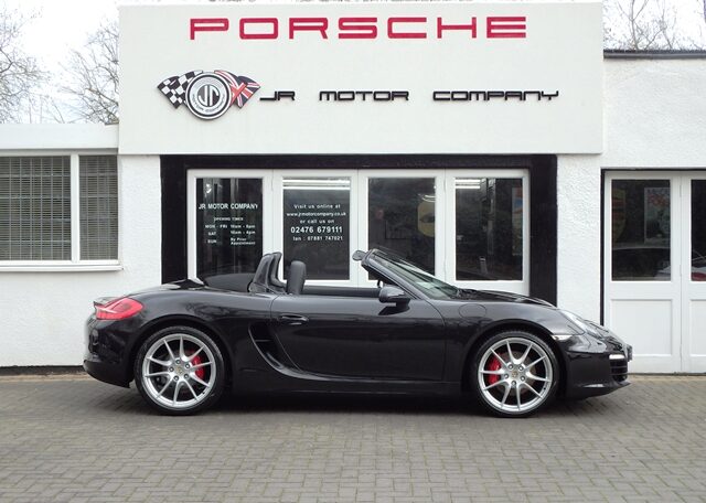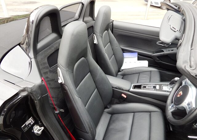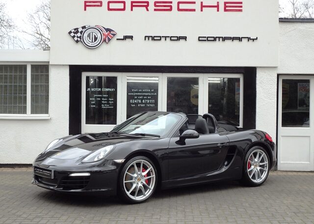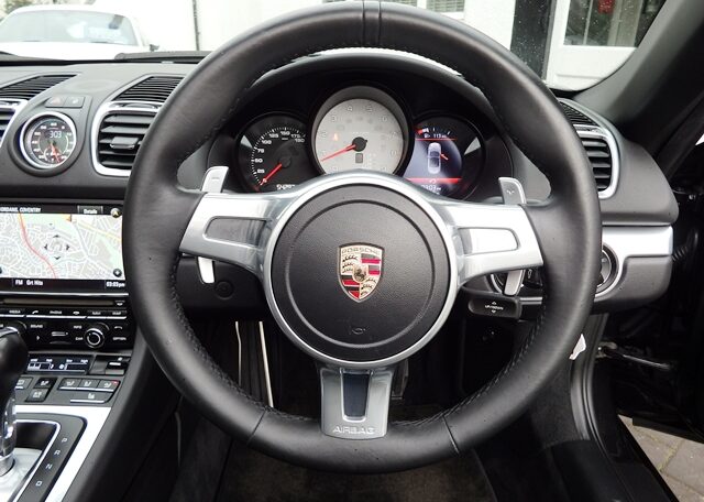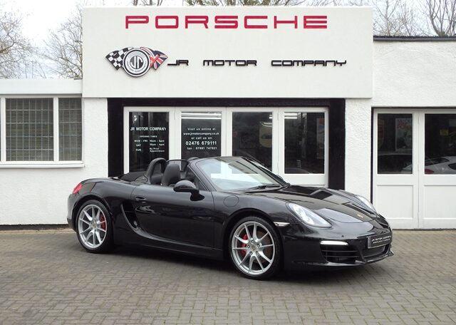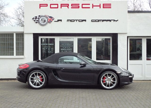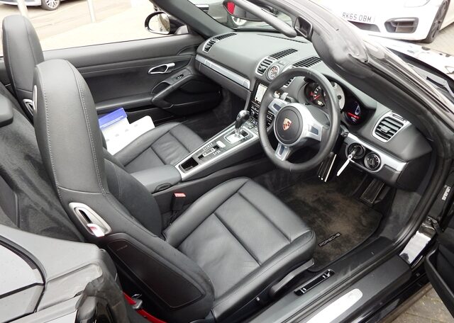 Cars like this don’t come around very often! This is a huge specification Boxster 3.4 S 981 PDK Finished in Basalt Black metallic paint with a huge list of factory fitted options which includes Black smooth leather heated seats,seatbelts in guards red,Sport Design smooth leather steering wheel with paddle shifters,(PDK) Porsche Doppelkupplung double clutch 7 speed gearbox,air conditioning,black dials,(PSM) Porsche Stability Management,(PCM3.1) Porsche communications management Satelite navigation inc telephone module,Bluetooth interface and USB multimedia interface linked with Porsche sound package plus,top tinted windscreen,auto light function,bi xenon headlights,ultrasonic rear park assist,Porsche over mats,wind deflector with fly catchers,rollover bar finished in bodycolour,sports exhaust tailpipes in black,black hood,Sport chrono package plus with sport and sport plus buttons together with a black faced stopwatch,red calipers and fully refurbished 20 inch Carrera S alloy wheels with colour crested centers wrapped in Pirelli P Zero N rated tyres to complete the package.This stunning Boxster S comes complete with a fully documented OPC Porsche center plus specialist service record totaling 7 stamps just completed by ourselves together with all spare keys and handbook pack.Stunning looks with a huge specification and impeccable service portfolio!