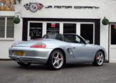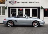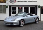 This is very special and unique Boxster S finished in rare Polar Silver metallic Paint and complete with a huge rare factory specification which includes full Metropole blue smooth extended leather interior including doors and dashboard,smooth leather heated hardback sports seats with Porsche crests embossed,leather 3 spoke smooth leather sports steering wheel,silver dials,on board computer,CDR23 CD player linked with Bose sound package,CDC4 Multichanger and CD storage pack,18″ Carrera 5 spoke alloy wheels with crested centers wrapped in Pirelli P Zero N rated tyres,rollover bar in black,wind deflector with flycatchers,Porsche overmats,climate controlled air conditioning,top tint windscreen and a metropole blue hood to complete the look and this huge spec.This special and unique Boxster has been lovingly cared for and maintained and comes with a fully documented Porsche OPC plus specialist service record totaling 9 stamps together with all handbooks and spare keys.This really is a special Porsche that will be a perfect investment for the new owner!