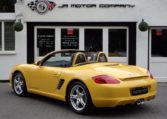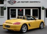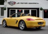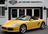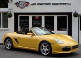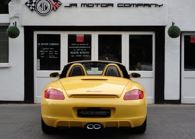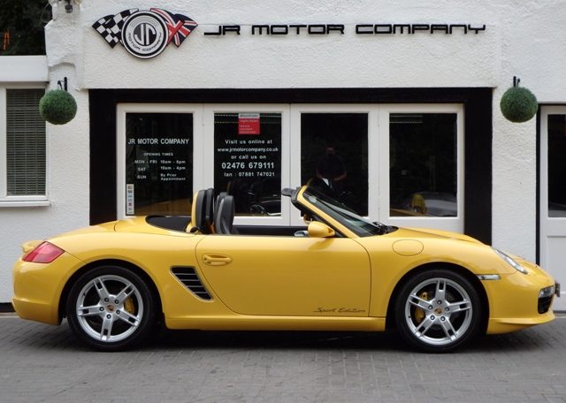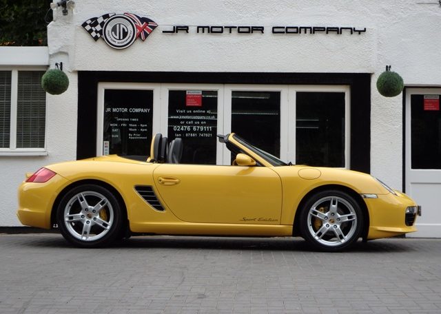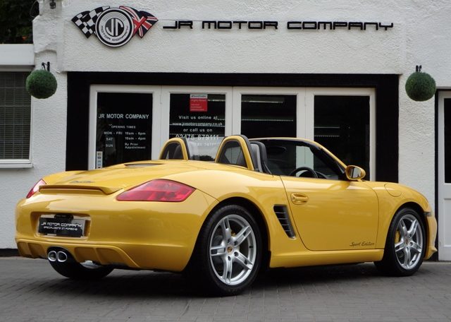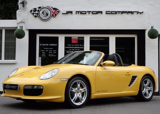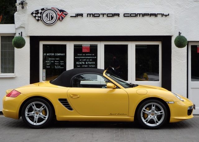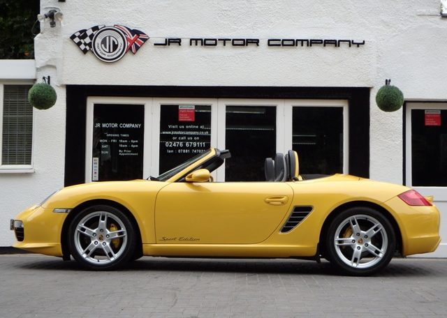 This is a very unique and special one of a kind Boxster Sport Edition finished in rare Speed Yellow paint in stunning condition and with an extensive list of factory fitted options which includes very rare Sport Design exterior Package,full black extended leather trim to include dash and doors with hardback sports seats with Porsche crests embossed,smooth leather sports steering wheel,seat belts in yellow,(PCM 2.1) Porsche communications management Satellite navigation with extended navigation linked with Porsche sound package plus and CD storage together with a Parrot bluetooth kit fitted and an ipod attachment with usb and rear reversing camera,top tint windscreen,black dials,fully refurbished 18″ Boxster S alloy wheels with colour crested wheel centers wrapped in Bridgestone Potenza N rated tyres,calipers powder coated in yellow,side decals,Porsche overmats,bi xenon headlights with wash,(PSM) Porsche Stability Management,(PASM) Porsche active suspension management,climate controlled air conditioning,sports shifter,alluminum side vents,rollover bar in bodycolour,stainless door entry guards,auto dimm interior and exterior mirrors with rain sensor,extended storage,wind deflector with flycatchers and a black convertible hood to complete a very special sport edition.This stunning Boxster has been lovingly kept and maintained and has a fully documented OPC Porsche plus specialist service record totaling 6 stamps and just completed by ourselves together with handbook pack and spare keys.The car is a pleasure for us to sell and in outstanding condition.Stand out with this unique low production special Boxster!