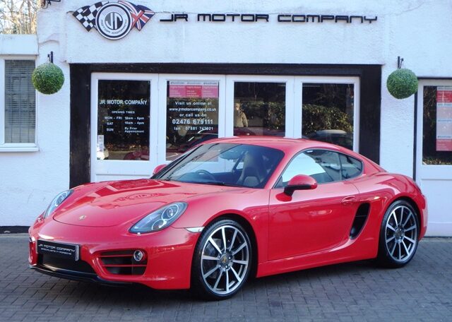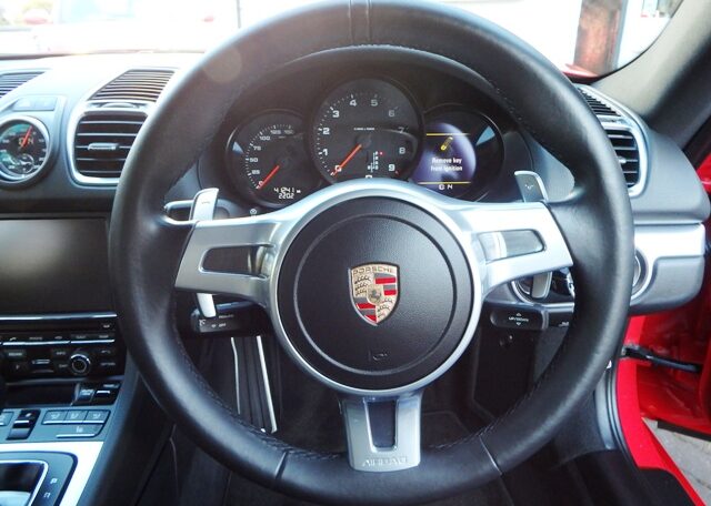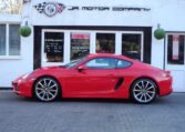 This is a huge specification Cayman 981 2.7 PDK Finished in Guards Red gloss paint with a massive list of factory fitted options which includes Black leather heated and vented seats,extended leather to instrument surround,door handles and center box,electric folding exterior mirrors,black dials,3 spoke Sport Design steering wheel with paddle shifters,cruise control,alluminium interior package,dual zone climate controlled air conditioning,light design package,Sport chrono package plus with sport and sport plus modes together with stopwatch with black face,(PASM) Porsche active suspension management,(PSM) Porsche Stability Management,Sport mode,(PCM3.1) Porsche communications management Satellite navigation with CD player,Bluetooth Phone prep and universal audio interface linked with Bose sound package,CD storage,top tinted windscreen,ultrasonic park assist front and rear,Porsche overmats,cargo net,Bi xenon headlights in black with dynamic cornering,auto headlights,(PVTS) Porsche vehicle tracking system,luggage partitian,Sports exhaust with sports exhaust tailpipes in black and fully refurbished 20 inch Carrera Classic alloy wheels with genuine new colour crested centers wrapped in Pirelli P Zero N rated tyres to complete the package and a very special 981.This stunning Cayman comes complete with a fully documented OPC Porsche plus Porsche specialist service record totaling 8 stamps just completed by ourselves together with all spare keys and handbook pack.Stunning looks with a huge specification,Outstanding!