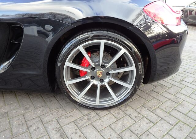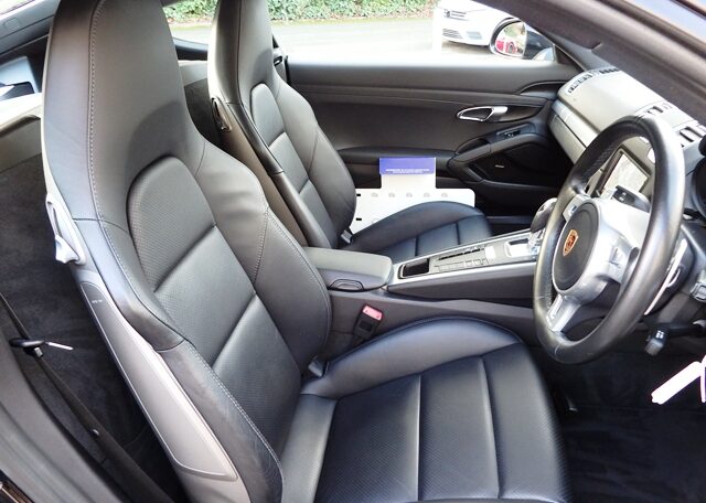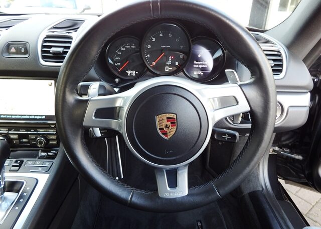 This is a huge specification Cayman 981 2.7 PDK Finished in rare Jet Black metallic paint with a massive list of factory fitted options which includes Black leather heated hard back Sports seats,black dials,3 spoke smooth leather Sport Design steering wheel with paddle shifters,dual zone climate controlled air conditioning,light design package,cruise control,(PSM) Porsche Stability Management,Sport mode,(PCM3.1) Porsche communications management Satellite navigation with CD player,DAB,Bluetooth Phone prep and universal audio interface linked with Bose sound package,CD storage,top tinted windscreen,ultrasonic park assist front and rear,model designation deletion,auto dimming interior and exterior mirrors with rain sensor,Porsche overmats,cargo net,auto headlights,luggage partitian,electric folding exterior mirrors,(TPMS) tyre pressure monitoring system,red calipers and fully refurbished 20 inch Carrera Classic alloy wheels with genuine new colour crested centers wrapped in Pirelli P Zero N rated tyres (alternative wheel options available upon request) to complete the package and over £16k in options.This stunning Cayman comes complete with a fully documented OPC Porsche plus Porsche specialist service record totaling 7 stamps together with all spare keys and handbook pack.Stunning looks with a huge specification,Outstanding!