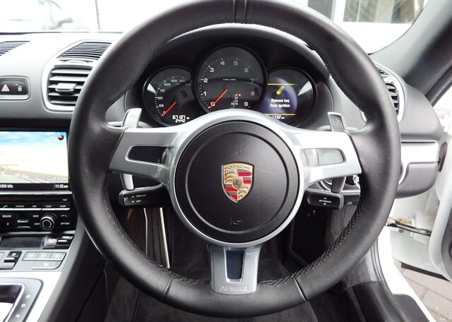 This is a lovely Cayman 981 2.7 PDK Finished in Pure White paint with a nice list of factory fitted options which includes Black smooth leather heated seats,smooth leather 3 spoke Sport Design steering wheel with paddle shifters,dual zone climate controlled air conditioning,light design package,cruise control,(PSM) Porsche Stability Management with sport mode,(PCM3.1) Porsche communications management Navigation,CD player,Bluetooth Phone prep and universal audio interface linked with Porsche sound package,CD storage,top tinted windscreen,Porsche overmats,auto headlights,luggage partitian,park assist front and rear,sports exhaust tailpipes in black,calipers finished in red and fully refurbished 20 inch Sport techno alloy wheels finished in gloss black with oem colour crested centers wrapped in Pirelli P Zero N rated tyres (alternative wheel options available upon request) to complete the package and a very stunning 981.This Cayman comes complete with a fully documented OPC Porsche plus specialist service record totaling 6 stamps just completed by ourselves together with all spare keys and handbook pack.Stunning looks with a great specification,Outstanding!