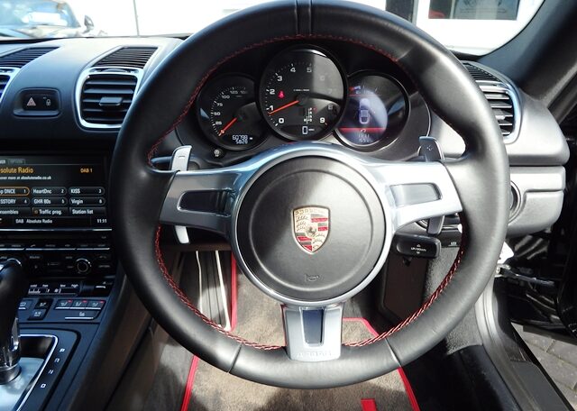 This is a huge specification Cayman 2.7 981 PDK Finished in Basalt Black metallic paint with a massive list of factory fitted options which includes Black leather smooth leather heated seats with Porsche crests embossed,extended smooth leather to include dashboard,doors,instrument surround,door handles,armrests and center box,leather center console trim,black dials,3 spoke Sport Design steering wheel with paddle shifters and red stiching,seat belts in guards red,air conditioning,light design package,power steering plus,(PSM) Porsche Stability Management,Sport mode,(PASM) Porsche active suspension management,(PCM3.1) Porsche communications management with CD player,DAB,Bluetooth Phone prep and universal audio interface linked with ASK sound package,CD storage,top tinted windscreen,ultrasonic park assist front and rear,electric folding exterior mirrors,Porsche overmats with leather edging in red,(PDLS) Porsche dynamic lighting system with Bi xenon headlights in black with wash,(PVTS) Porsche vehicle tracking system,auto headlights,sports exhaust tailpipes in black,cargo net,luggage partition,calipers finished in red and fully refurbished 20 inch Carrera S alloy wheels finished in satin platinum with new colour crested centers wrapped in Pirelli P Zero N rated tyres (alternative wheel options available upon request) to complete the package and a very special 981.This stunning Cayman comes complete with a fully documented OPC Porsche service record totaling 4 stamps with the most recent just completed by ourselves together with all spare keys and handbook pack.Stunning looks with a huge specification,Outstanding!